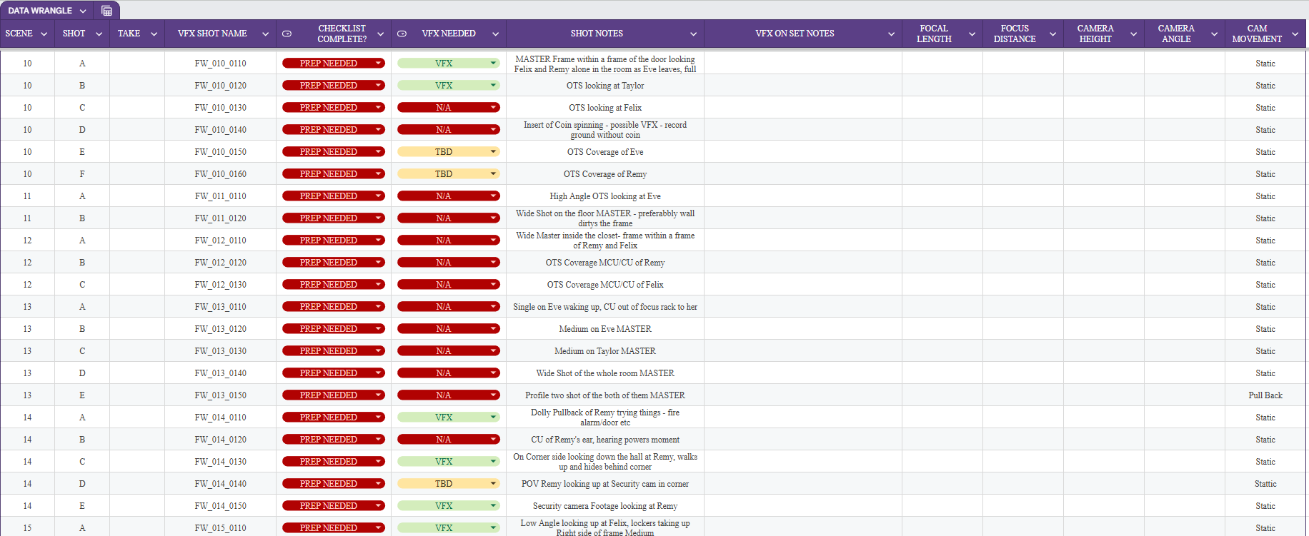Over our break at SCAD, me and my team have kept busy planning and building our pipeline. We held weekly meetings with the team, where were discussed timing, shotlists, and other things production day based. From the meetings we held as the VSFX team to the meetings we held with the director and producer, we were able to shift and break down the current shotlist to be clear what shots will require VSFX and which ones will not. Here is the look of that list. There is a current total of 119 shots.