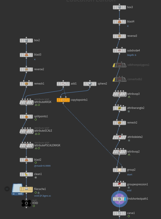 I basically take a POP sim and add a trail, carving based on the connectivity of the trails. For the future, should we want lightning/noisy trails, we can use this setup and add and per trail adjustments within the for each.