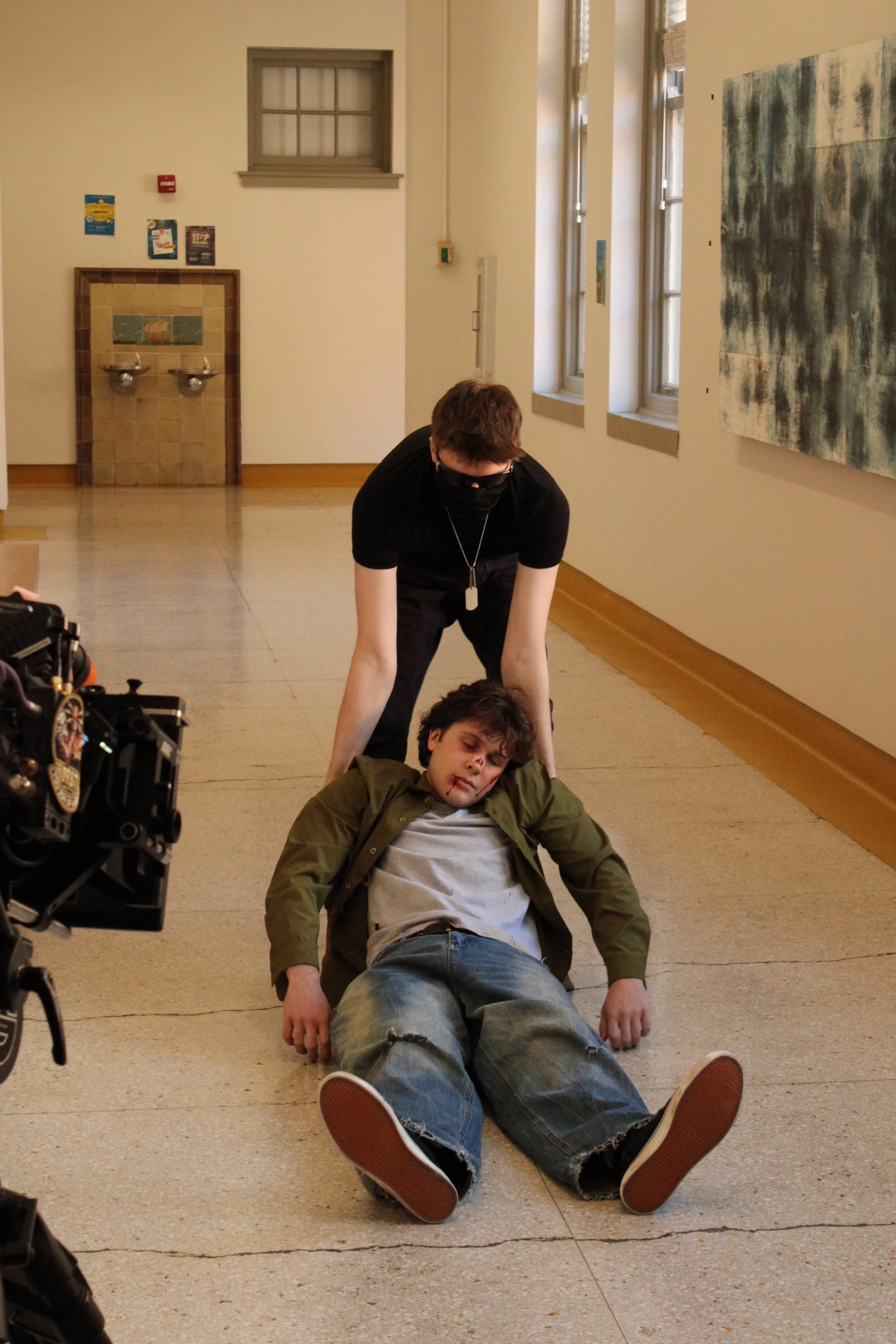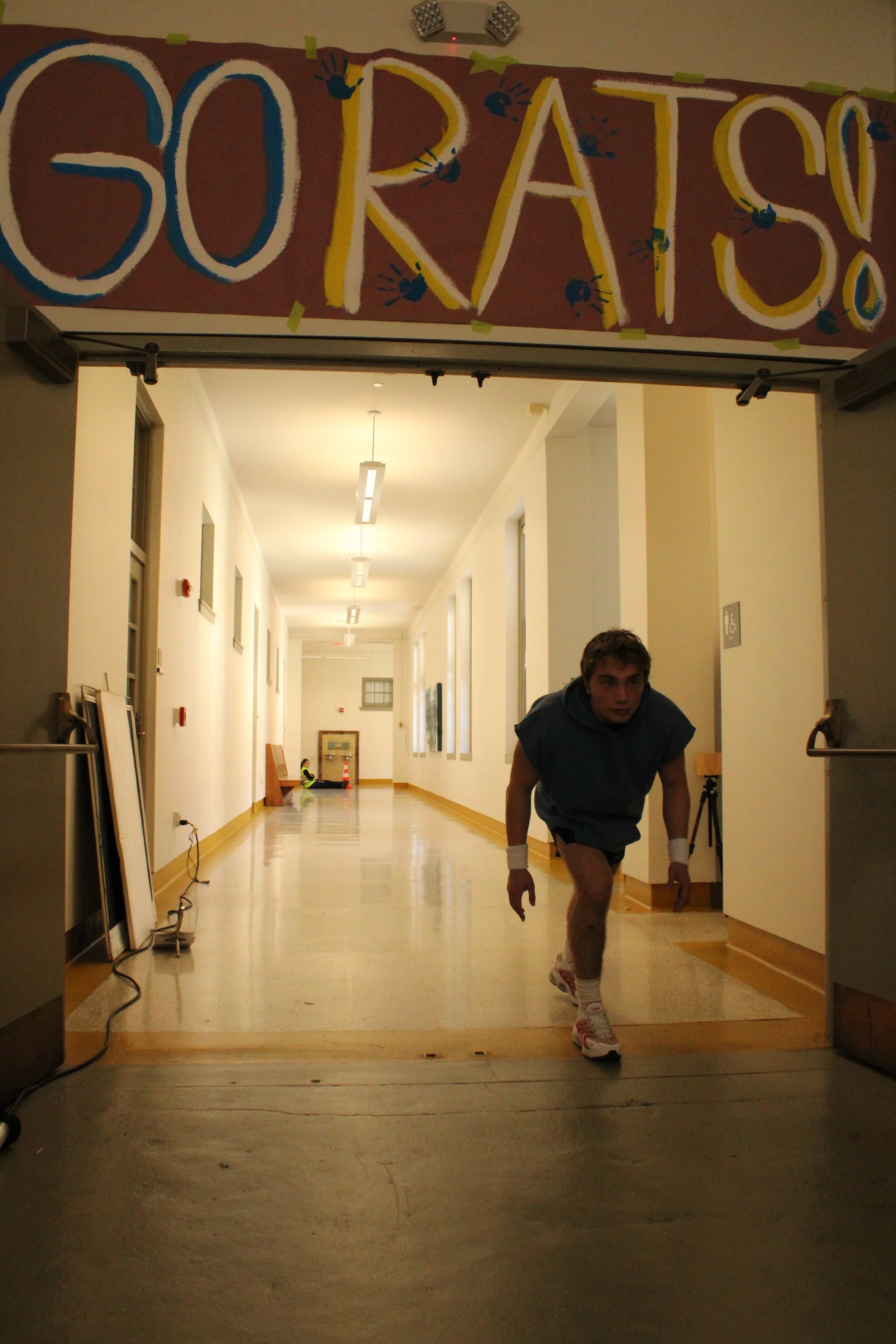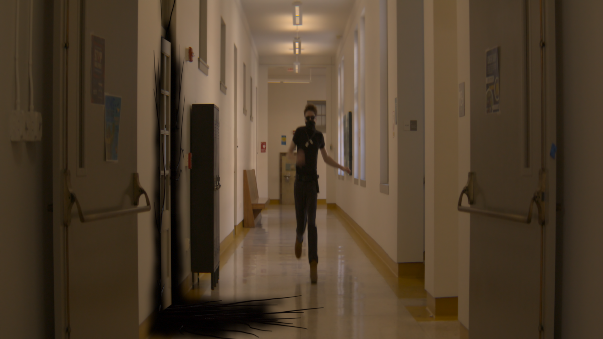 For this shot, I wanted to try some easy set extensions and alterations to our plates of Arnold. For our purpose, I decided to also do a clip with Aaron running down the hallway. Here is the original plate.
