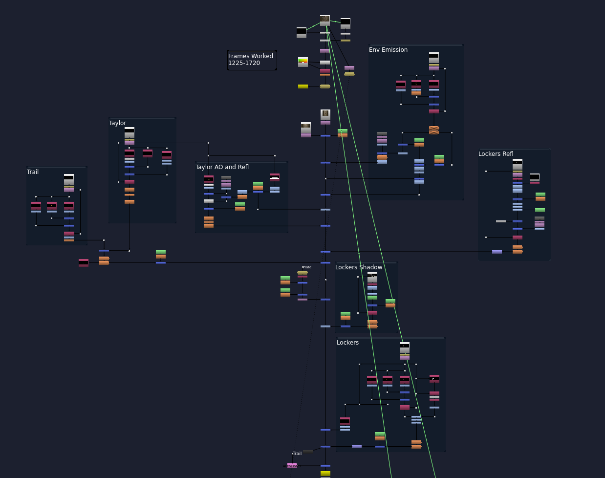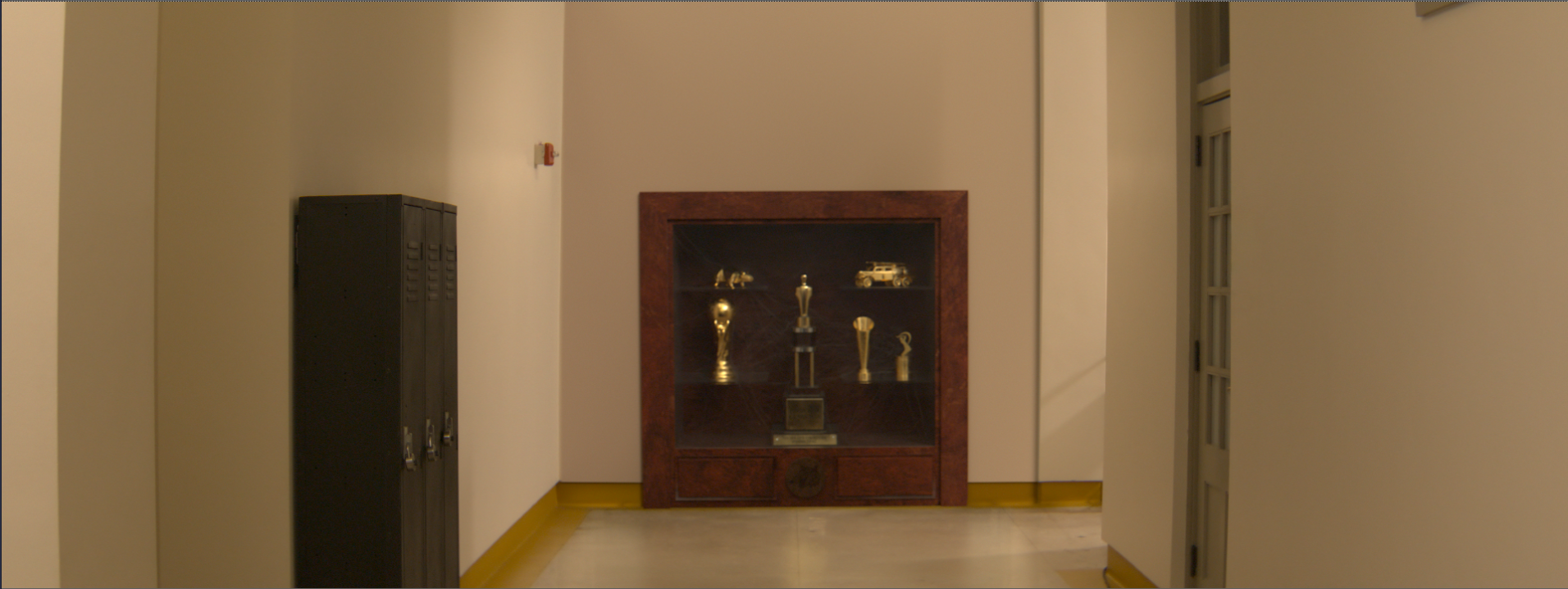 I then took Tripp’s Env that he made, including his lockers, and was able to render out the lockers to comp them in, as well as a light pass for the hallway interaction with the speed trail. Here is the final comp result.