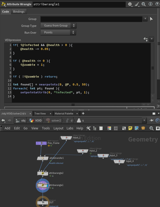 Here is the solver I used to create the infection as well as the health mask I built. The health mask drove the speed and distance the infection would take over.