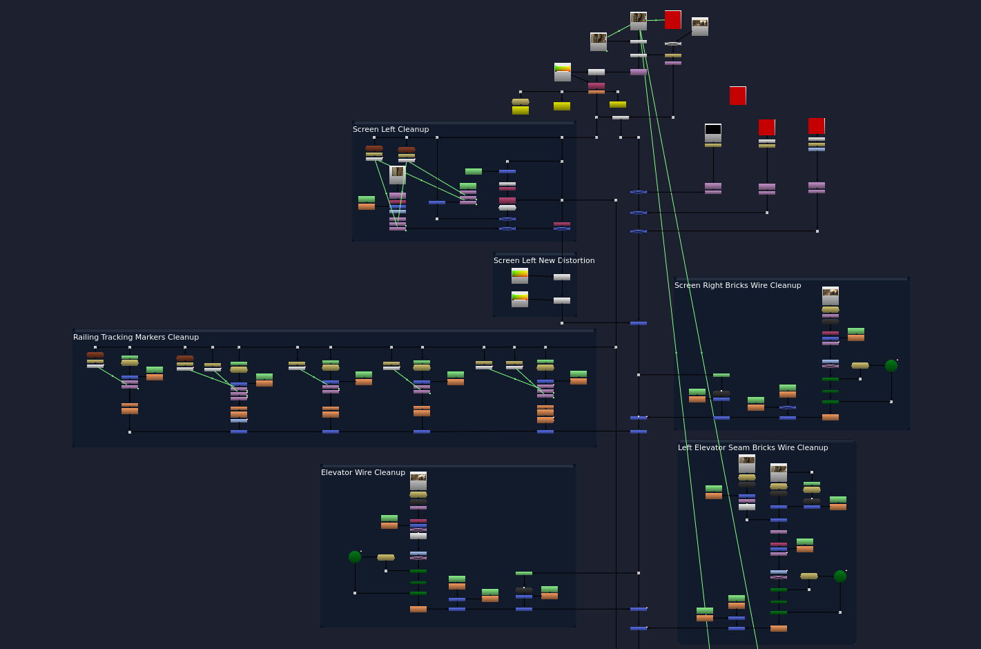 Here is the node tree currently set. For the clean up, I am using a tracked alembic camera that Zach got a good solve (<0.8 Pixel Error) on. I am projecting the still frame that I am using as the cleanup tool, and doing roto from there to mask around the proper area, in this case, where the wire is in frame. Here is a visual of what I am doing in 2.5 in Nuke.