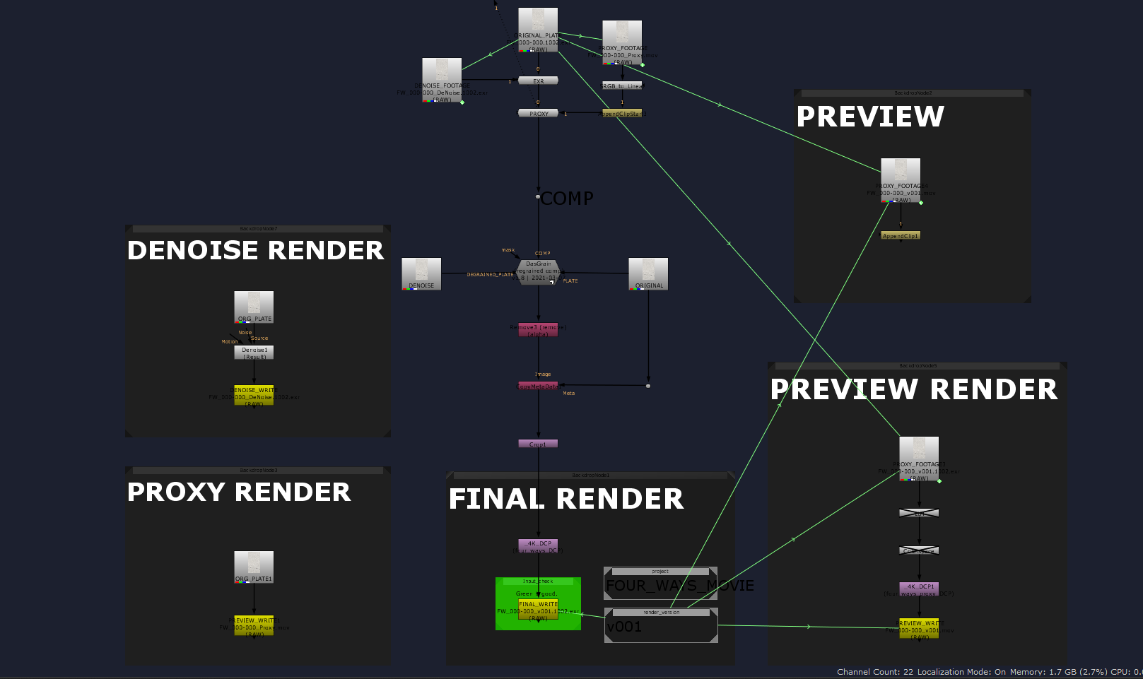 Over the break, I also built a pipeline ready Nuke file that can create and build our whole shot file structure, directly into the collaborative space, based on the file name. So once we get our footage and normalize them to EXRs, we can create our shot project files. It will find the EXRs and all exports we do will be named and be easy to find in our collaborative space. This will speed up our file making process and increase our production. Here is a compressed version of the tree.