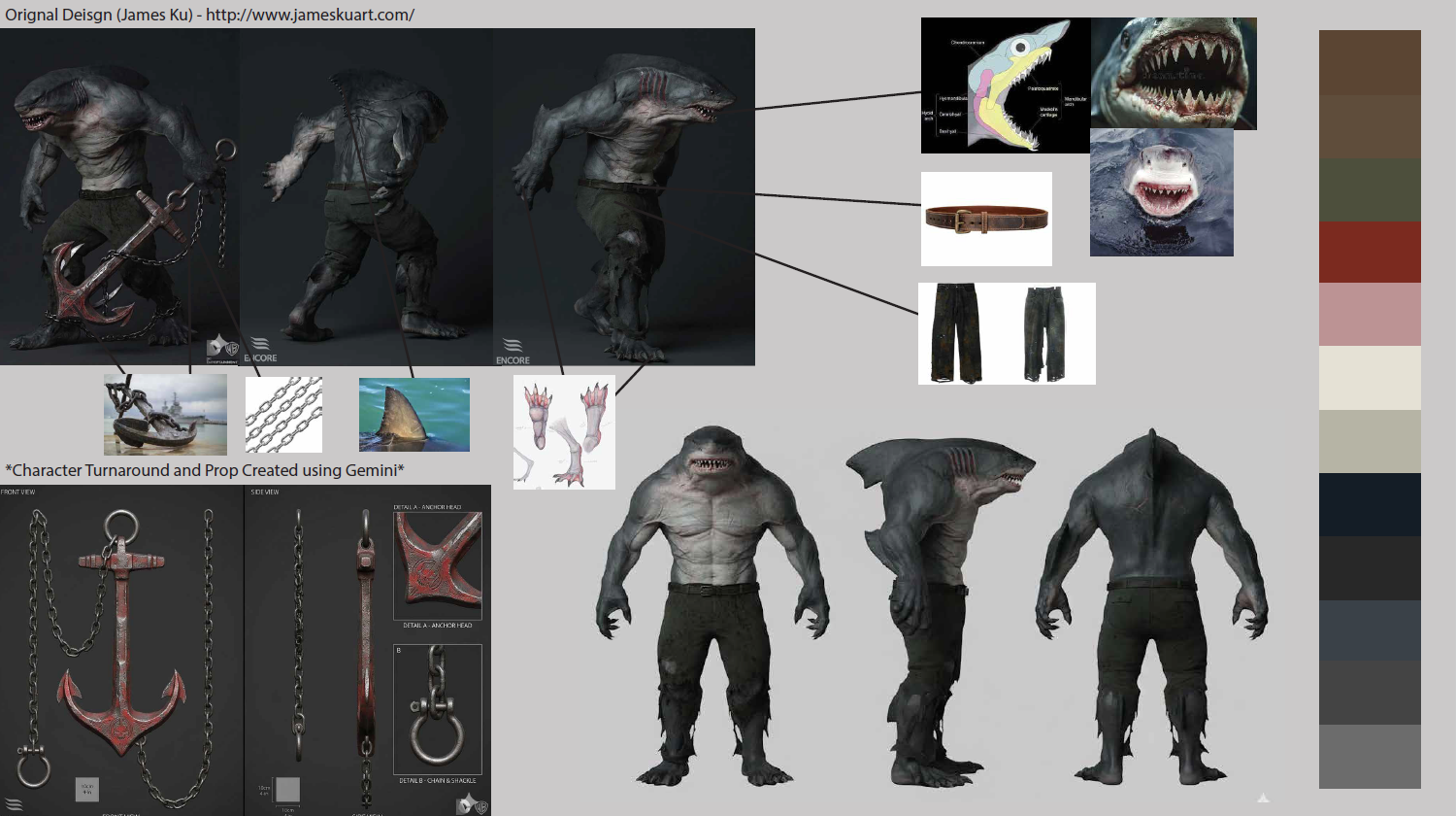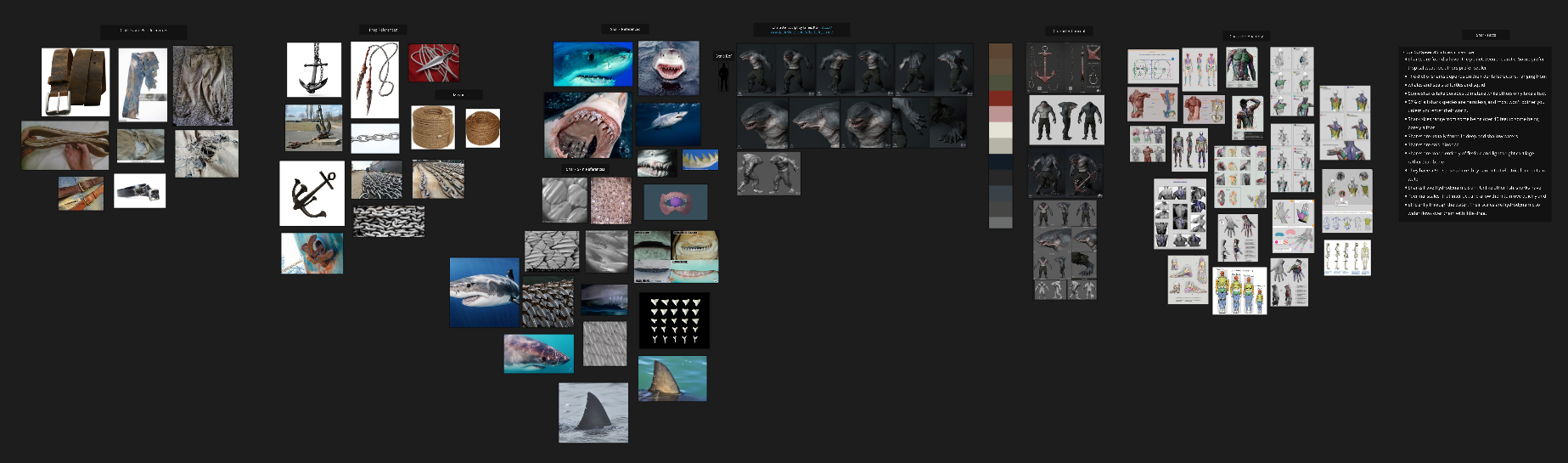 For this project, I aimed to build a deeper understanding of both human and shark anatomy. While visual references like images are helpful, engaging with research papers has been especially valuable in developing a more comprehensive perspective. This process has allowed me to better understand complex structures, such as the function of shark jaws, and to recognize the diversity across more than 500 shark species. Included here is a breakdown of my references, along with a curated color palette, annotated call-outs, and my primary reference document that guides this project.