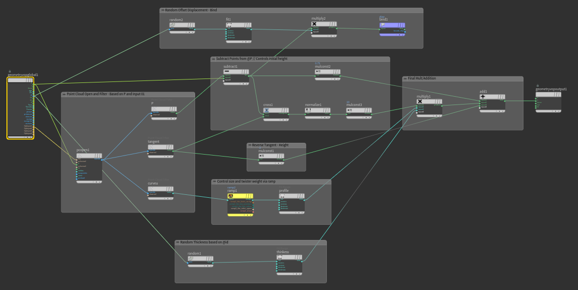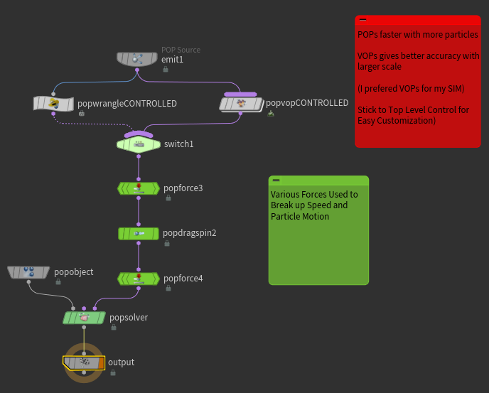 This setup samples nearby points, extracting directional data, and combining multiple forces into a final velocity field. Both the VEX and VOP approaches achieve the same result, the difference is purely workflow and visualization.