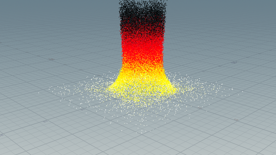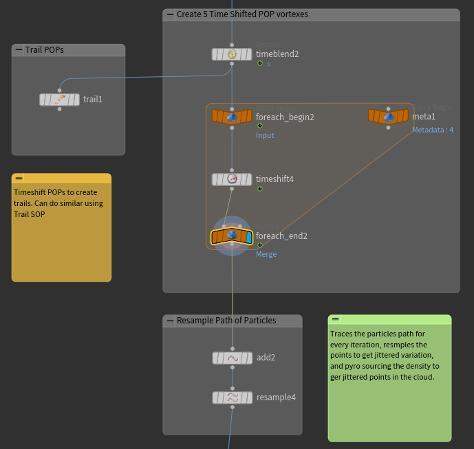 With the simplified POPs in place, you can add a Trail SOP or achieve a similar result with more control by using Time Shift, as shown below. Introducing a bit of echo to the POPs can also help generate more interesting motion, which will better drive the simulation in later stages.