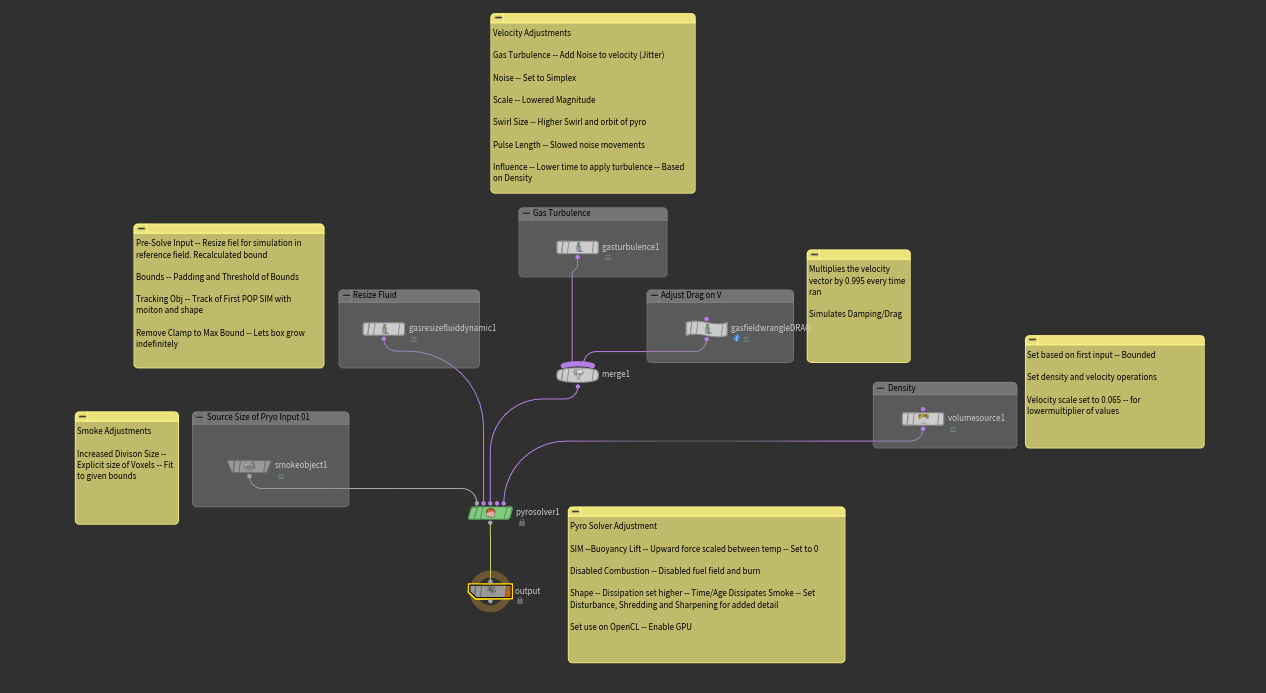 That said, the SOP-level Pyro Solver is extremely stable and reliable, making it a great choice for simpler effects. Since this particular simulation is fairly straightforward, it doesn’t require anything overly complex. SOP-level DOPs are especially useful for quick, efficient setups, and I often use them in those scenarios. Below is the layout showing the flow from SOPs into DOPs for simulating the vortex.