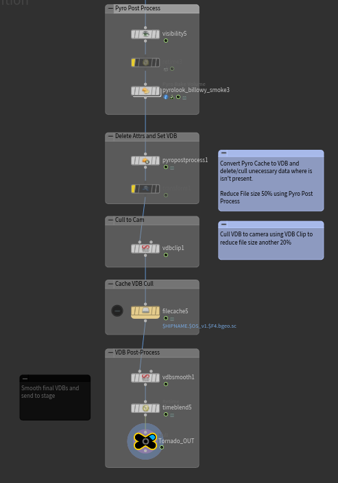 The final touches for this simulation involve baking the volume and converting it to VDB/16-bit float to reduce cache size. I also focus on culling geometry and simulations to the camera’s view; a simple VDB Clip node makes this process straightforward. After caching, I sometimes apply a subtle smoothing pass to eliminate any hard edges in the simulation, though this step is entirely optional depending on the desired look.